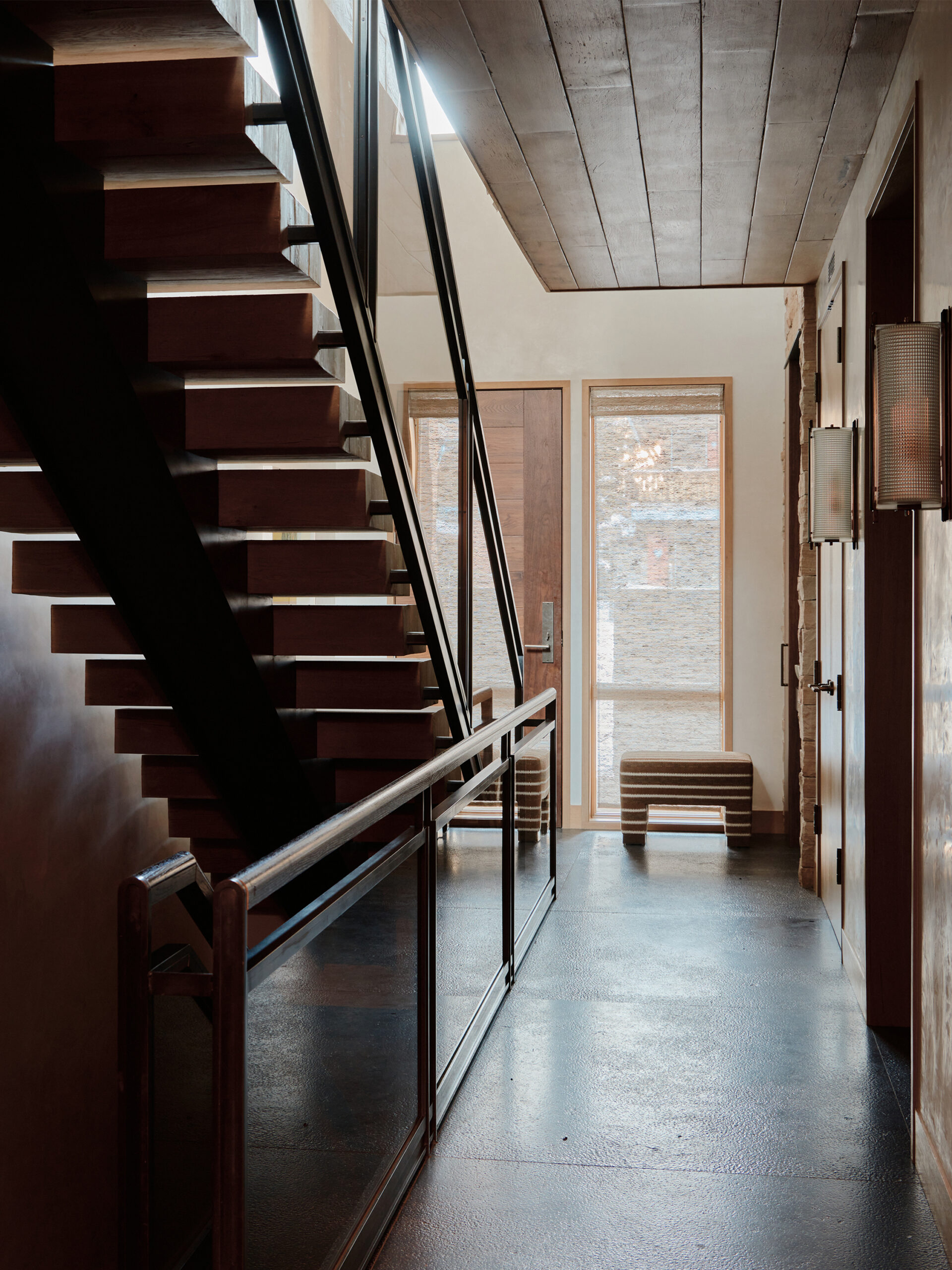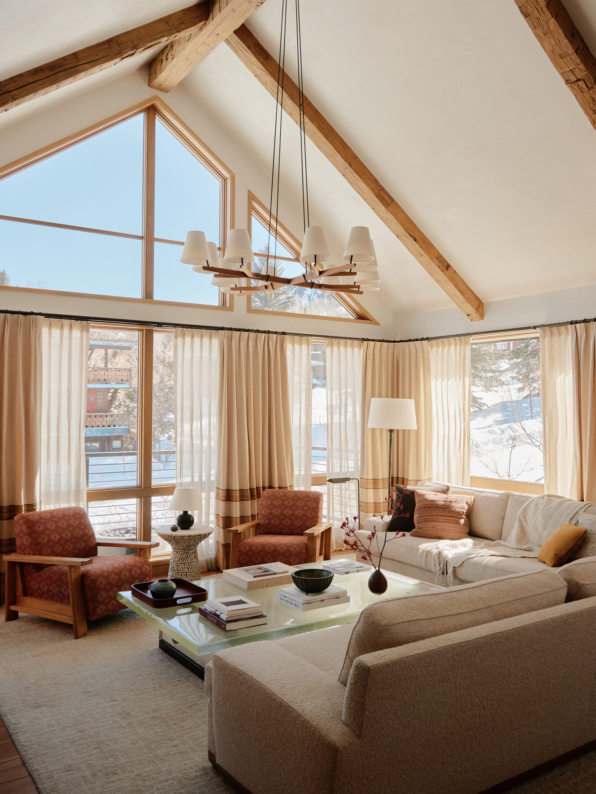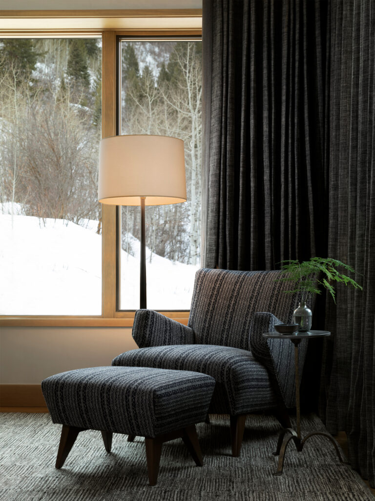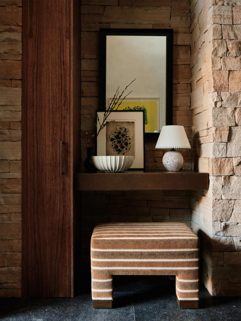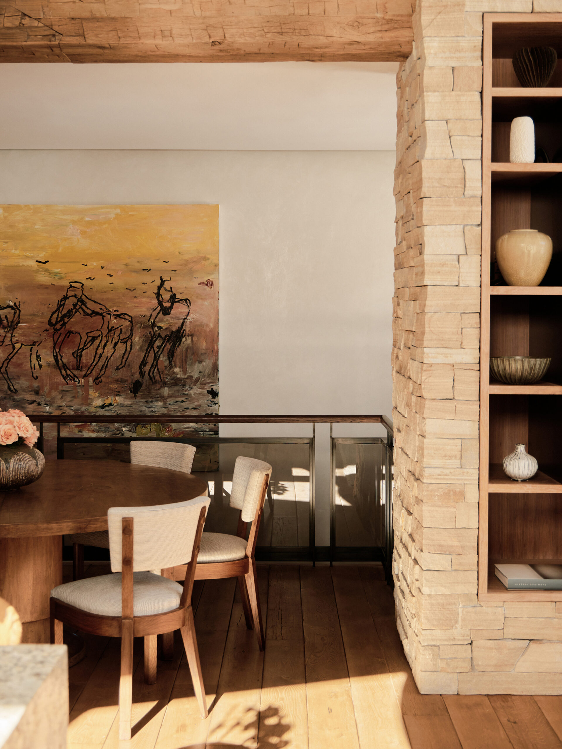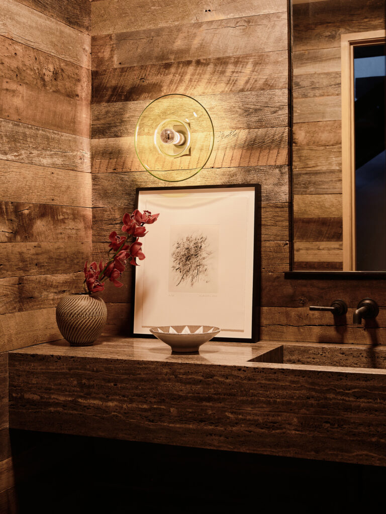 A richness of textures makes the connection between the comfort of home and the beauty of the surrounding landscapes in this Aspen townhome. Unique vintage furniture from a Paris flea market and custom-built pieces stand out against the backdrop of reclaimed barnwood, Colorado buff local stone, custom bronze metal work, and cashmere upholstered walls.