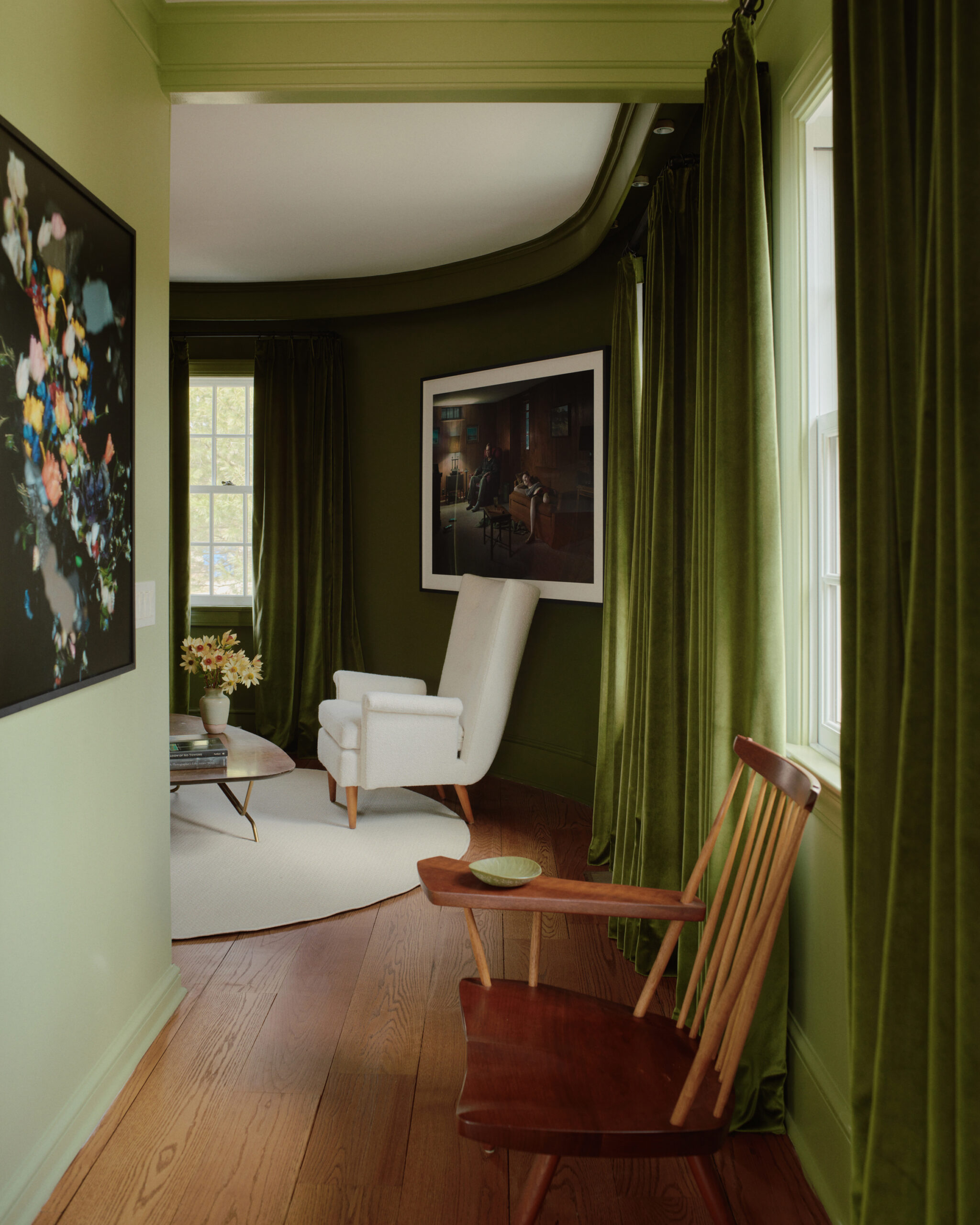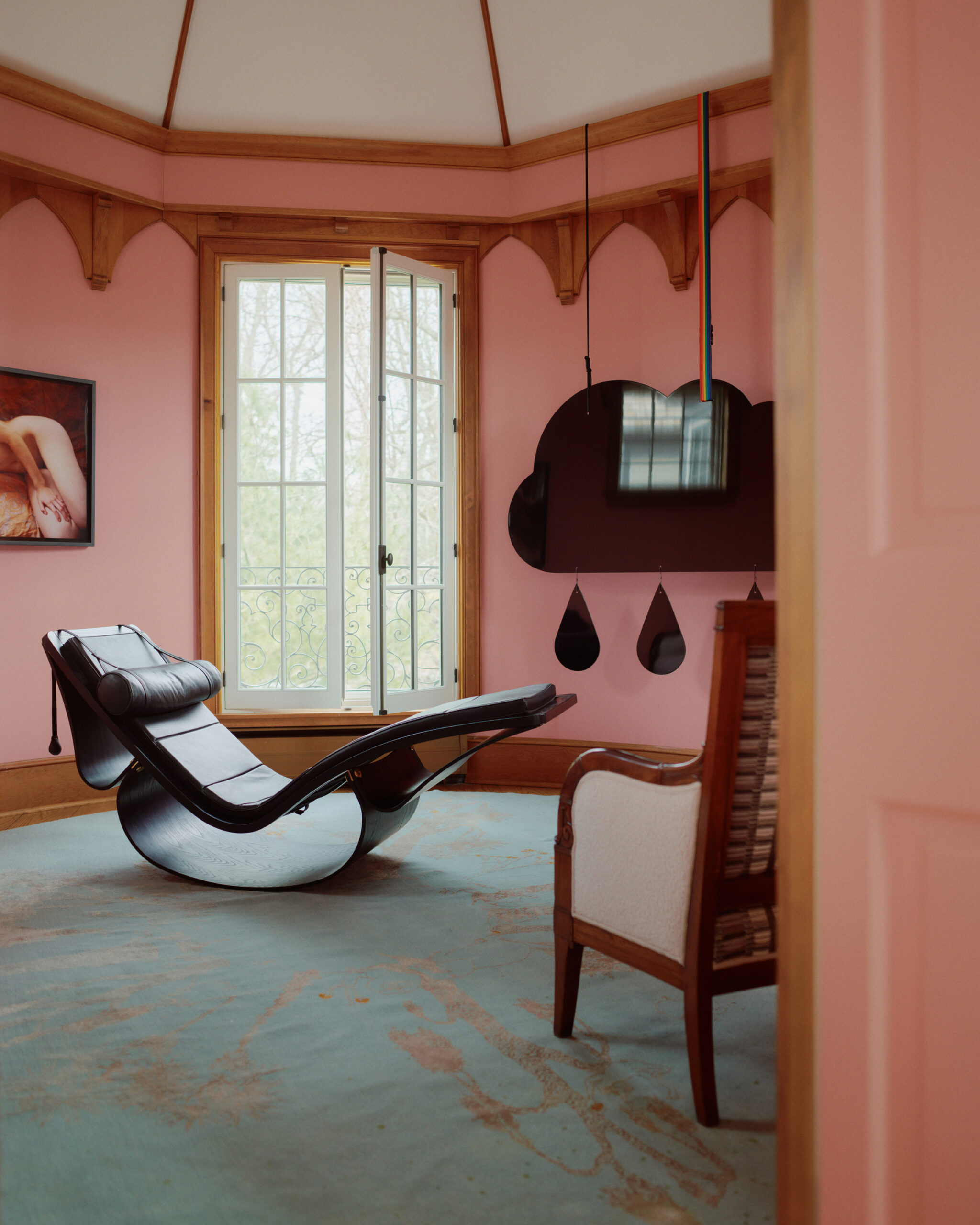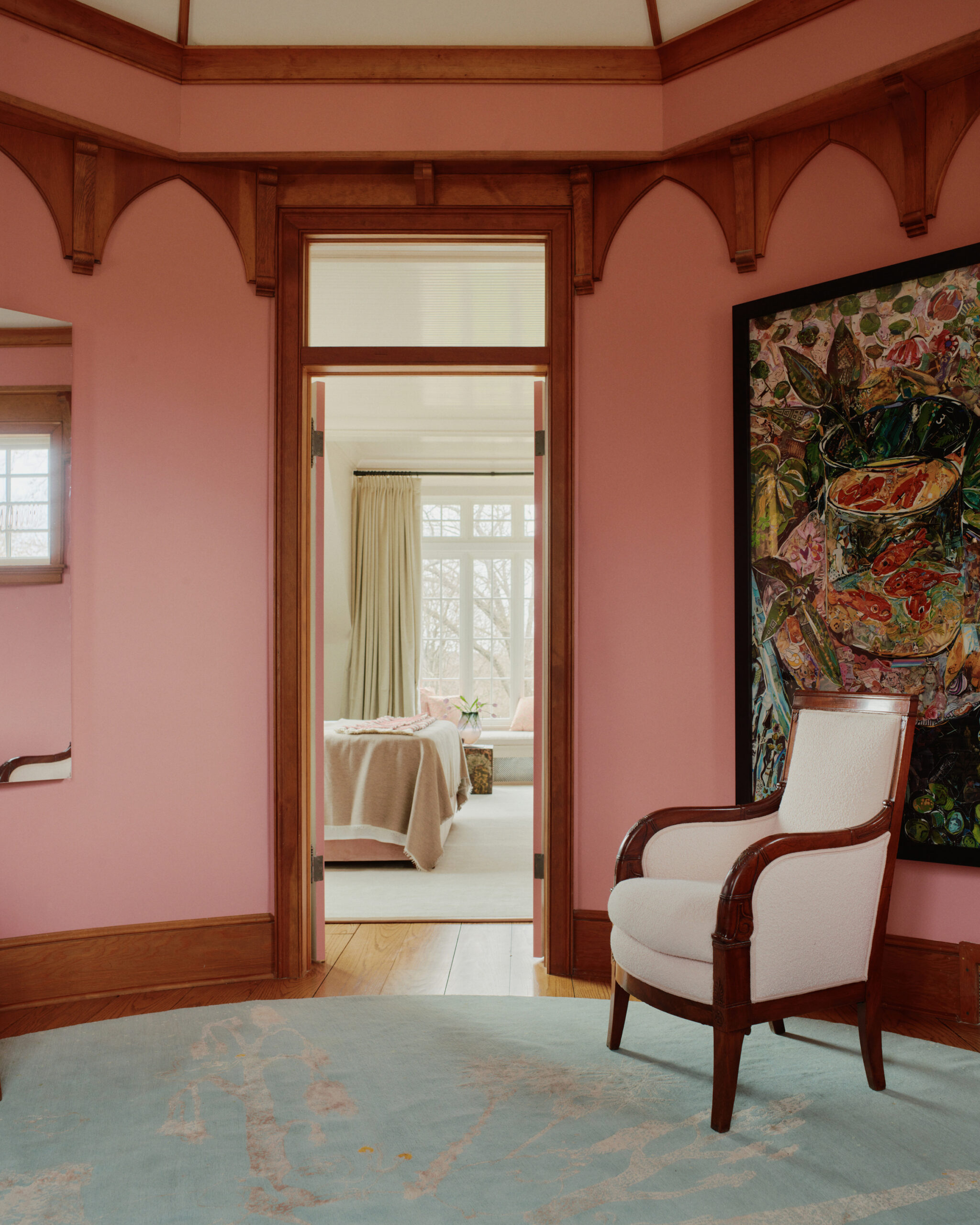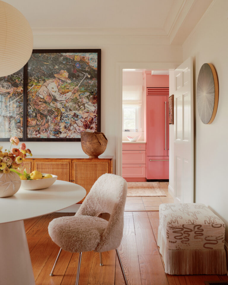 This renovation of a 19th-century Ehrick Rossiter carriage house in Connecticut blends bold color, art-focused interiors, and British country-inspired elegance to create a dynamic yet harmonious environment. Distinct palettes define each room, from vibrant pinks in the kitchen to earthy greens in the library, while curated artwork and sculptural furnishings—includinga Nakashima desk and a Viggo Boessen chair—