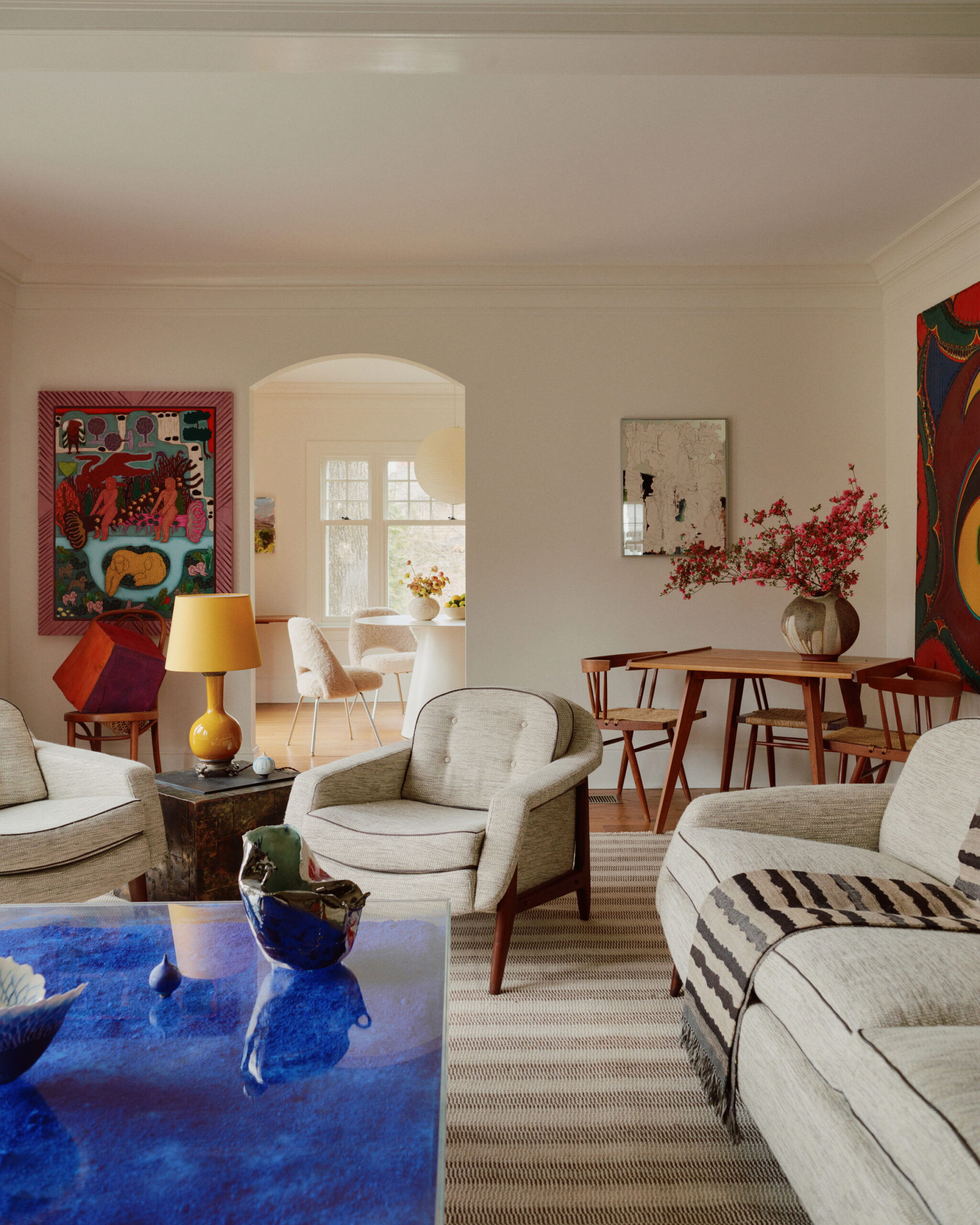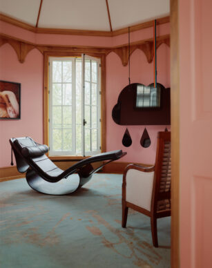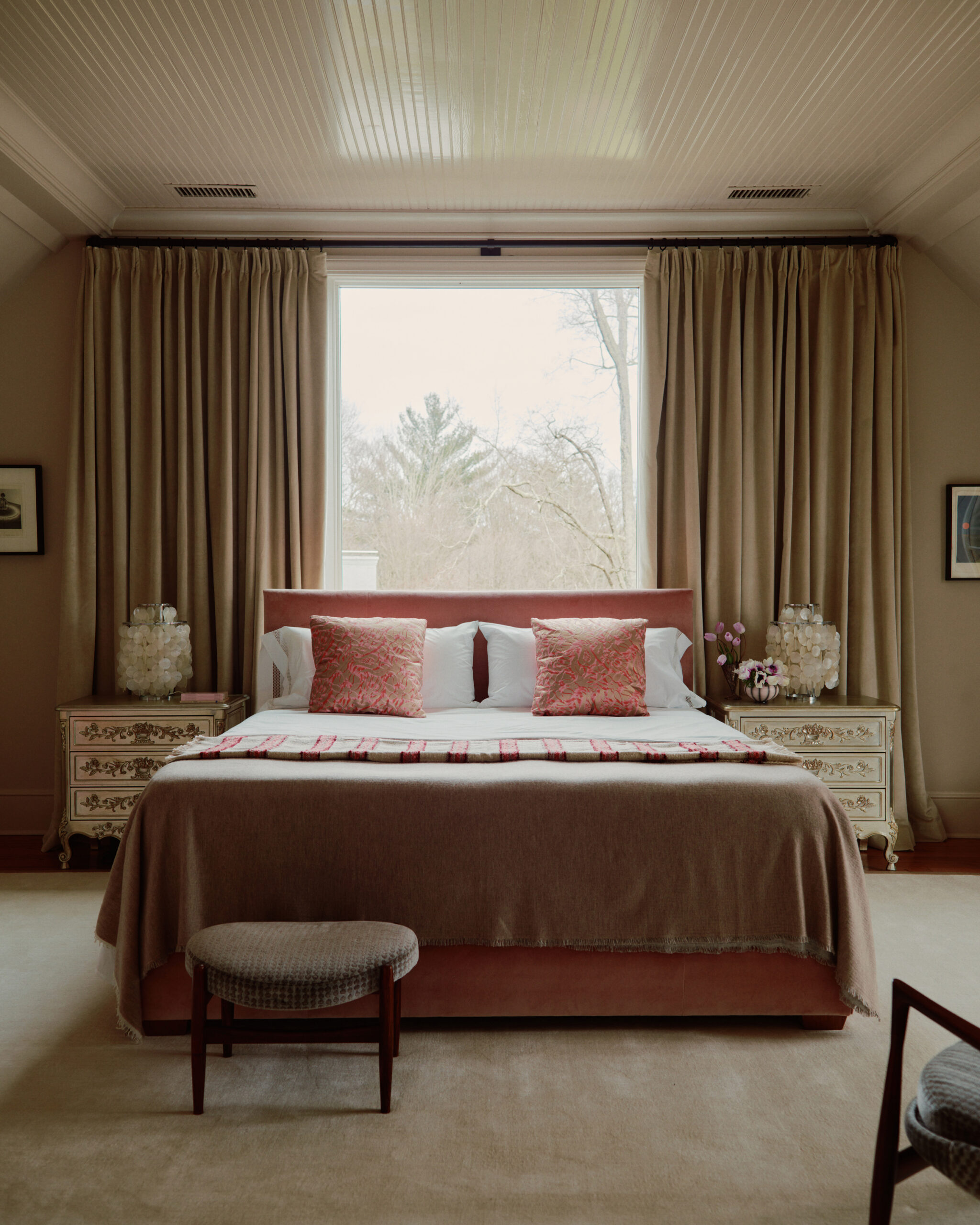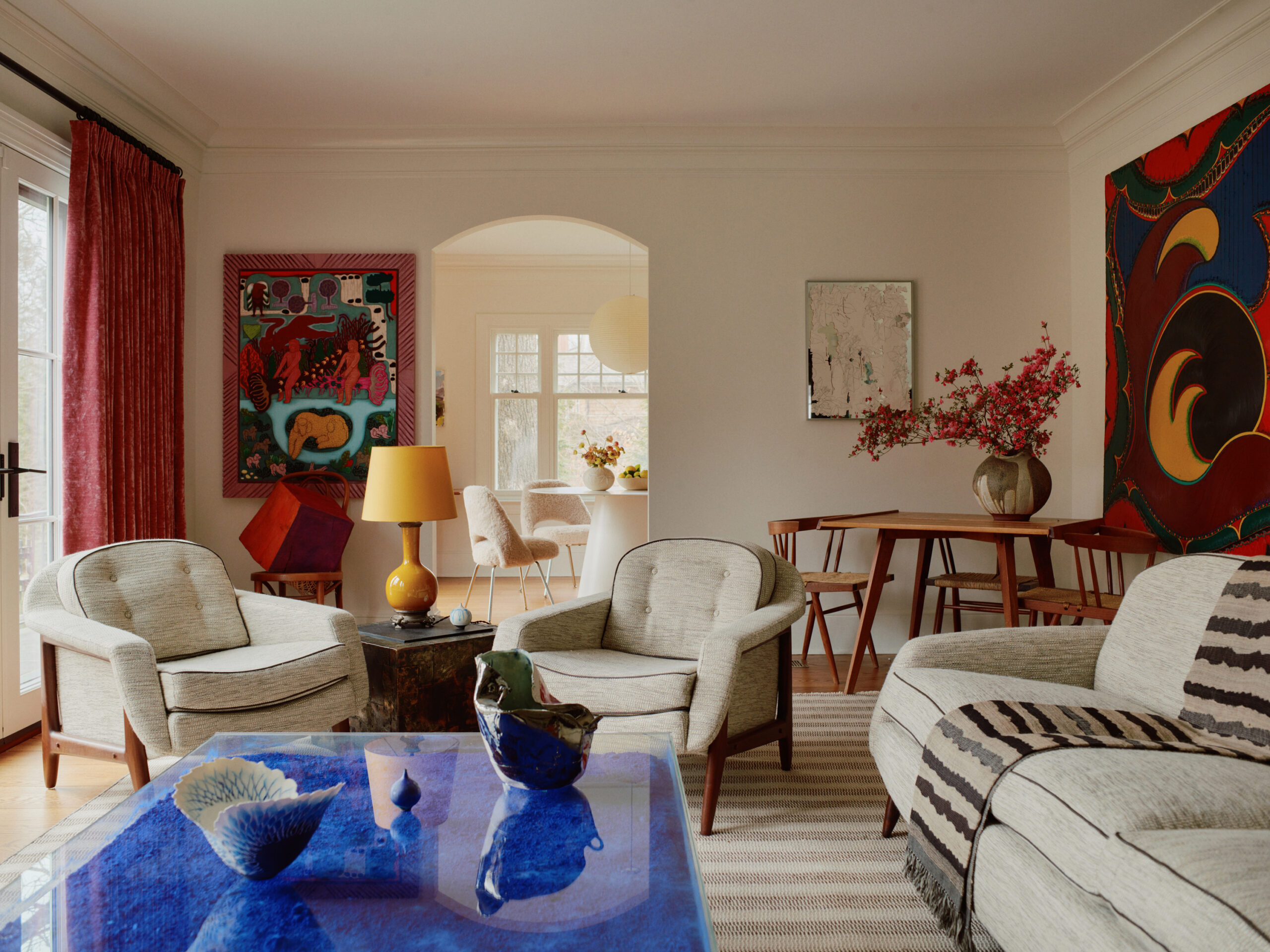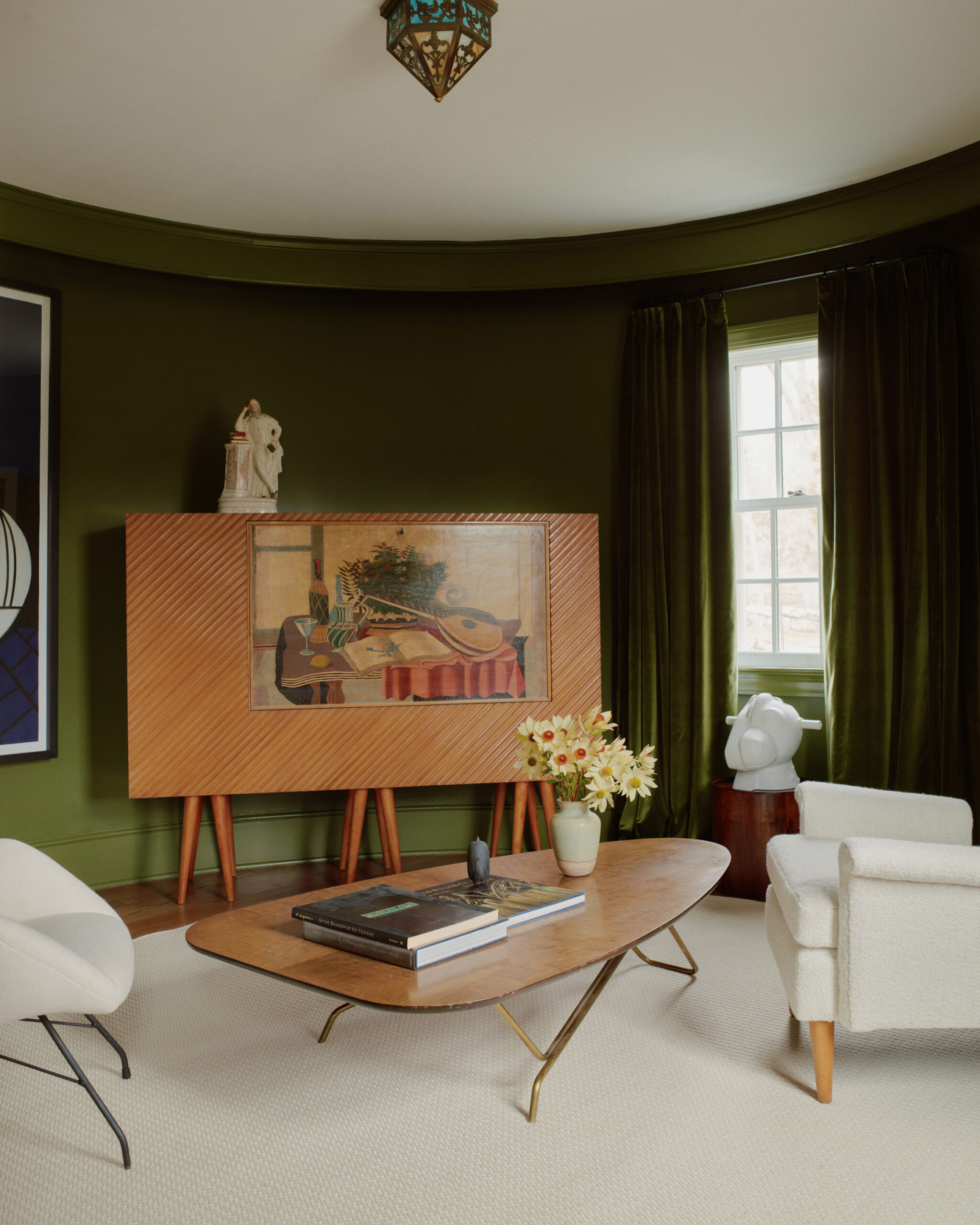 This renovation of a 19th-century Ehrick Rossiter carriage house in Connecticut blends bold color, art-focused interiors, and British country-inspired elegance to create a dynamic yet harmonious environment. Distinct palettes define each room, from vibrant pinks in the kitchen to earthy greens in the library, while curated artwork and sculptural furnishings—includinga Nakashima desk and a Viggo Boessen chair—