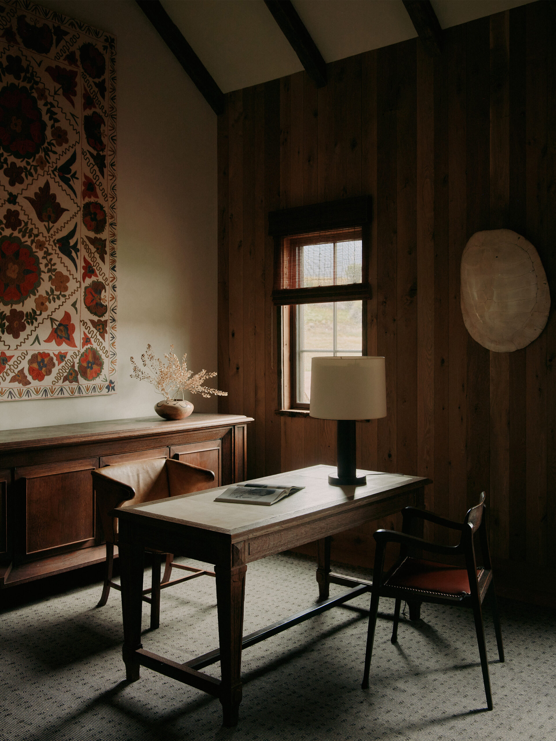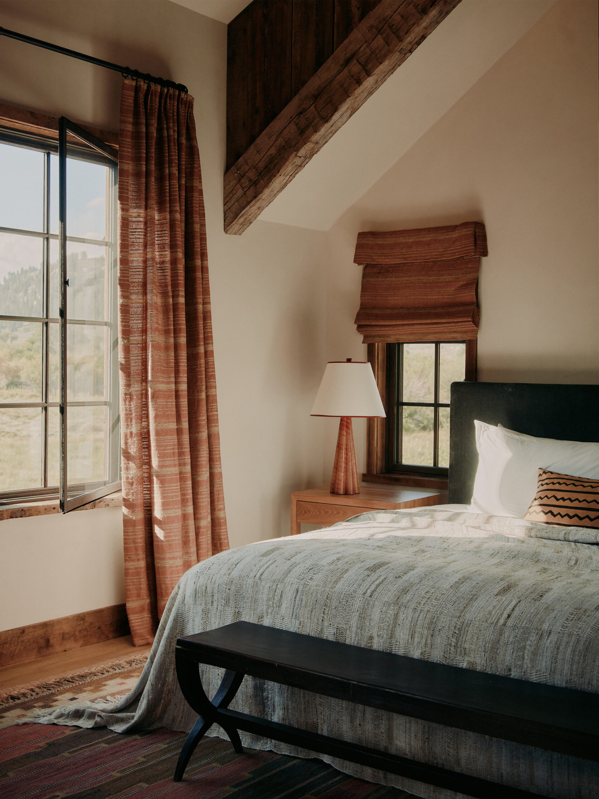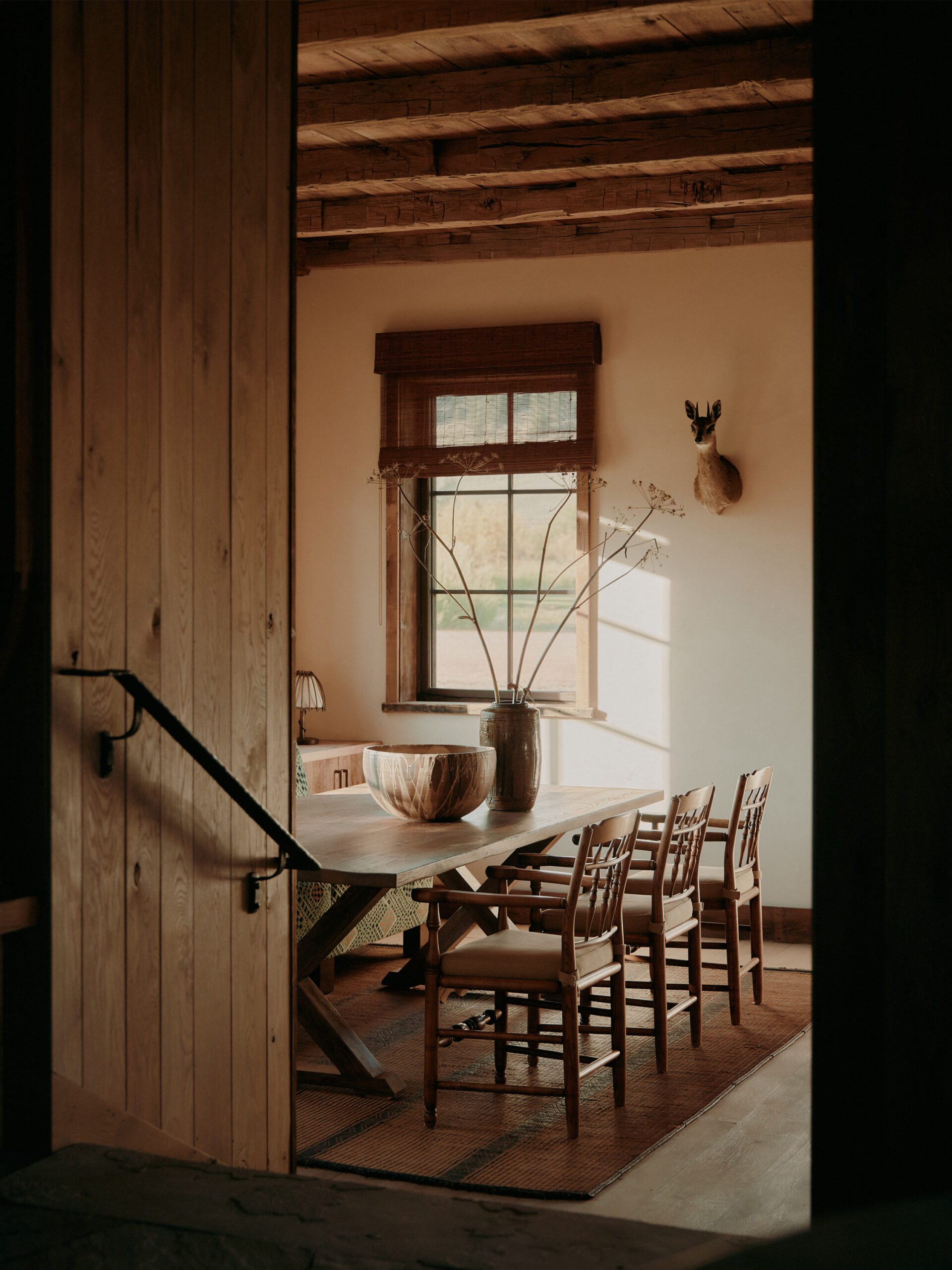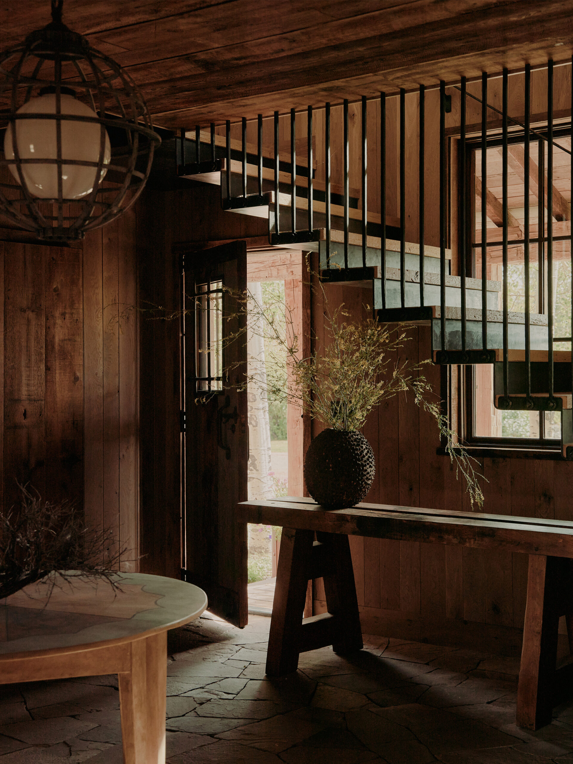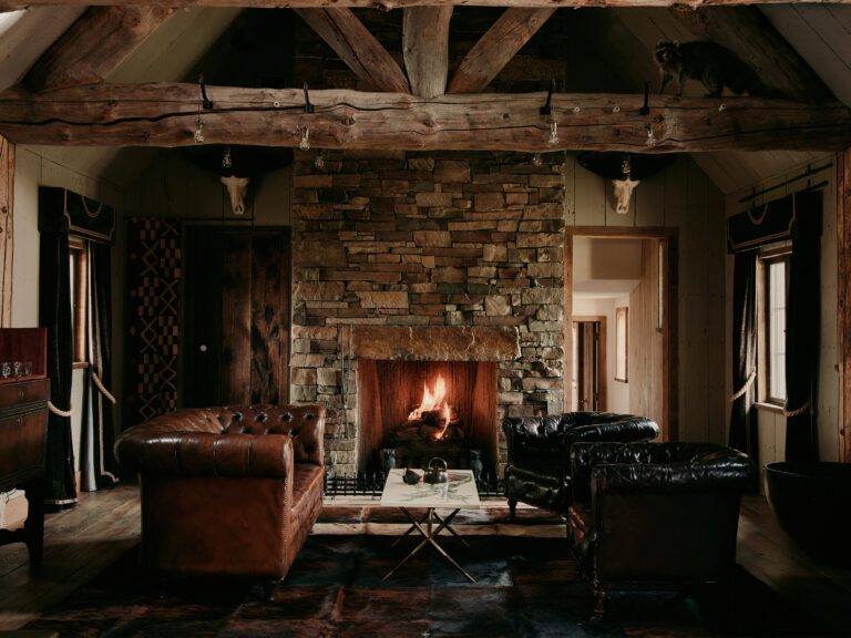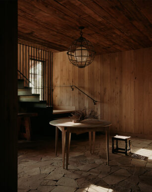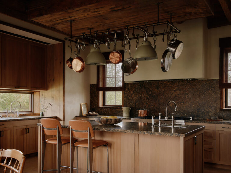 The double-height gabled ceiling of this residence's original structure was a starting point for our inspiration for creating this space that draws on the history and surrounding natural landscape of the place. Throughout the entire residence, there is a subtle appreciation of the landscape as you can catch glimpses of the shimmering meadows and towering mountains while surroundedby an interior palette evoking the changing seasons.