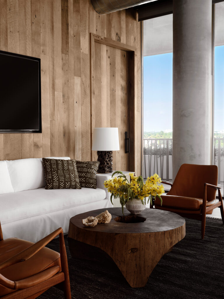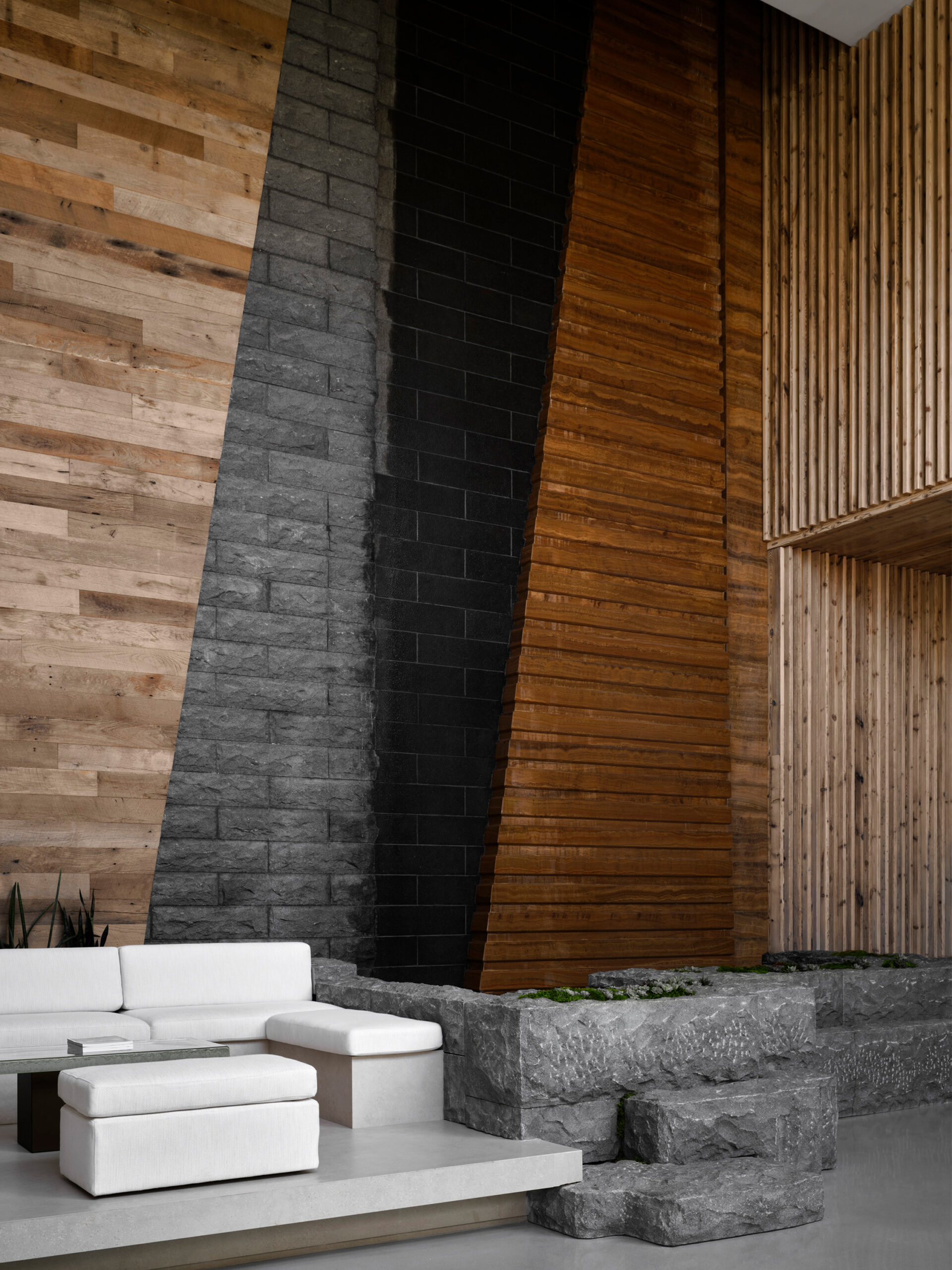 Natural elements such as reclaimed wood, stone,