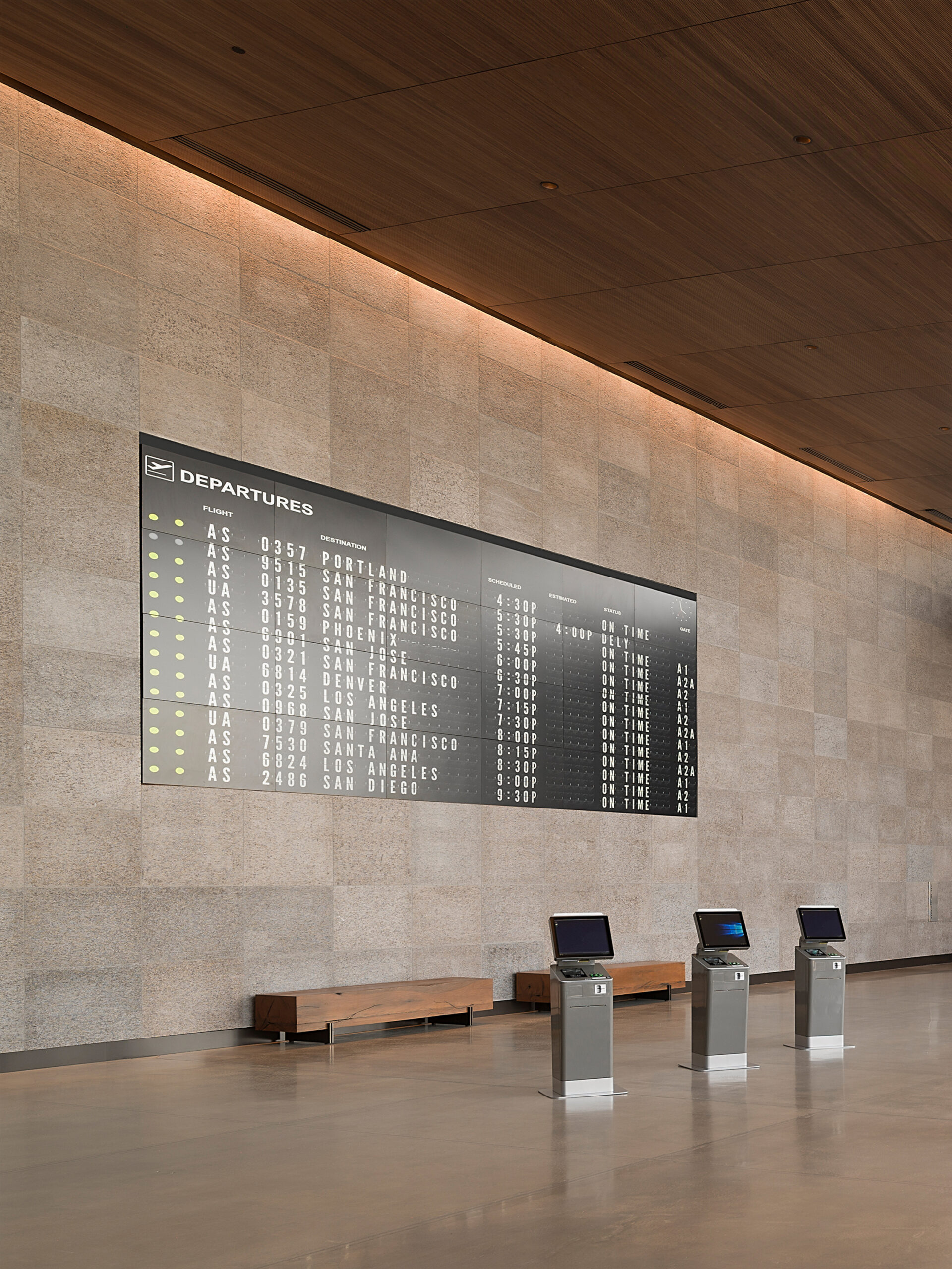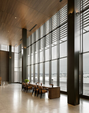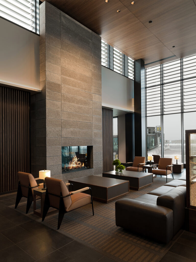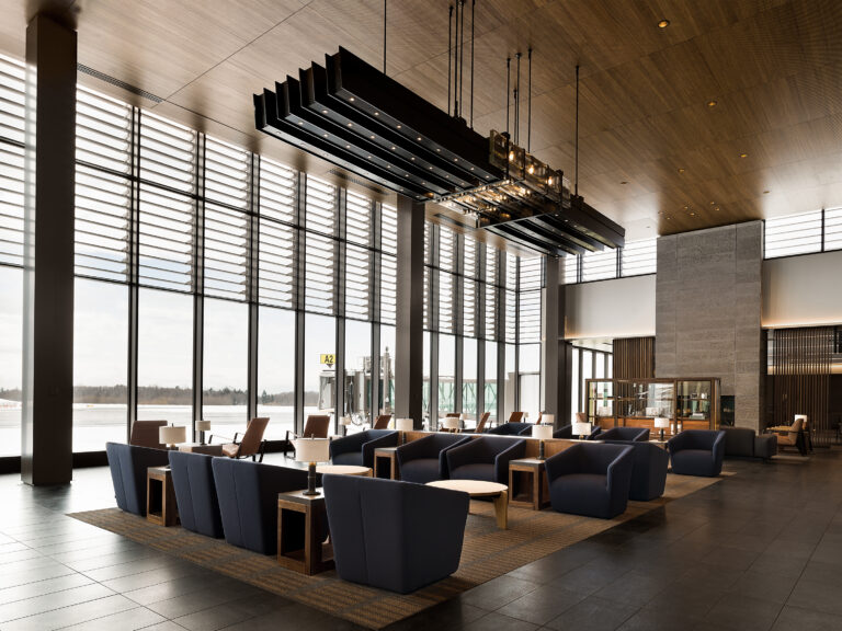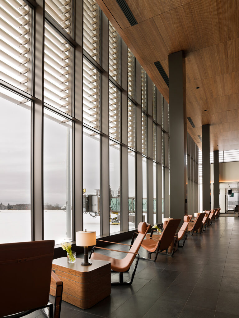 This privately developed airport in Seattle providesa bespoke and curated travel experience, with its cozy fireplaces and brown saddle-leather seating. Brown and blue tones throughout, industrial light fixtures, and horizontal louvers on the facade pick up the refined ruggedness of the Pacific Northwest.