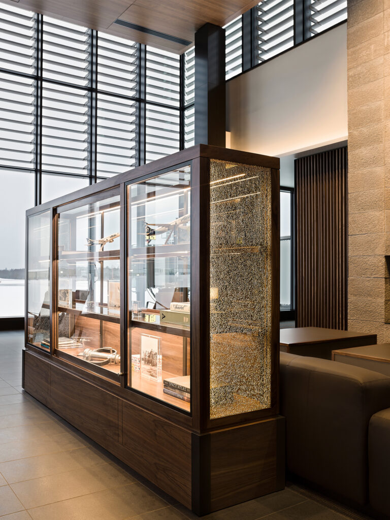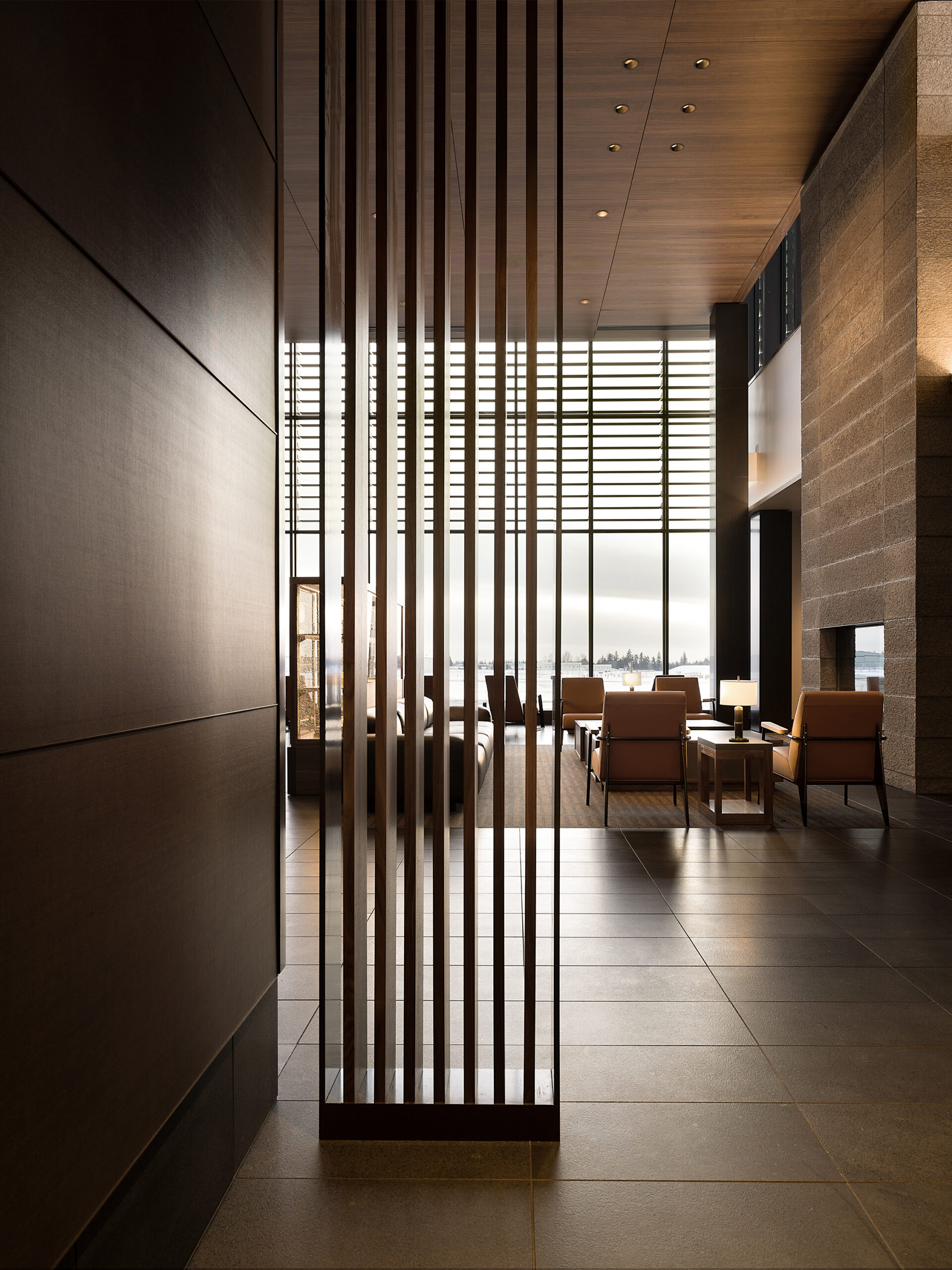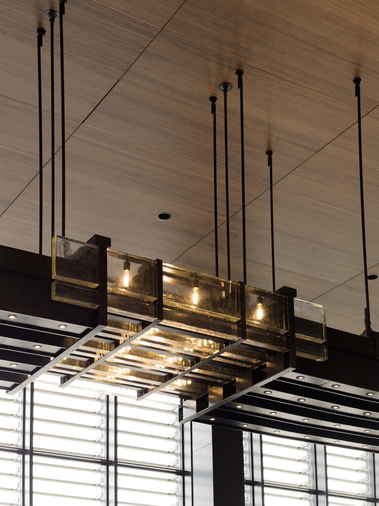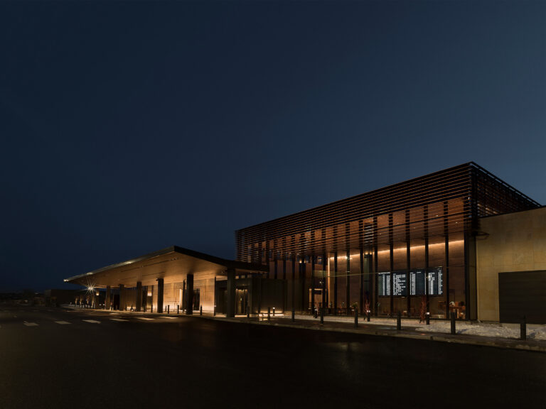 This privately developed airport in Seattle providesa bespoke and curated travel experience, with its cozy fireplaces and brown saddle-leather seating. Brown and blue tones throughout, industrial light fixtures, and horizontal louvers on the facade pick up the refined ruggedness of the Pacific Northwest.