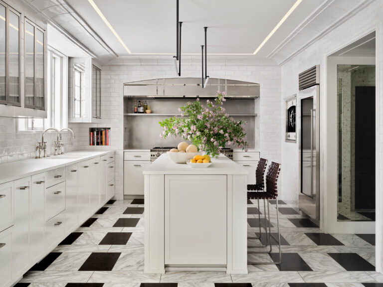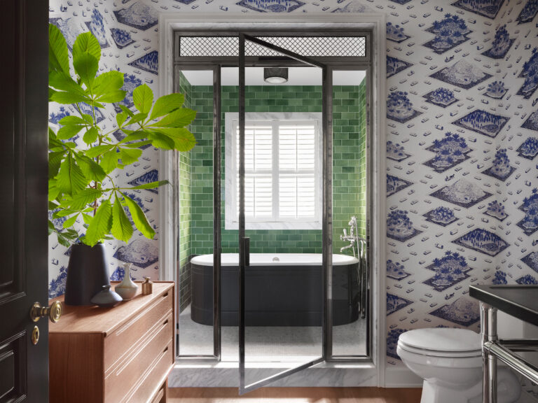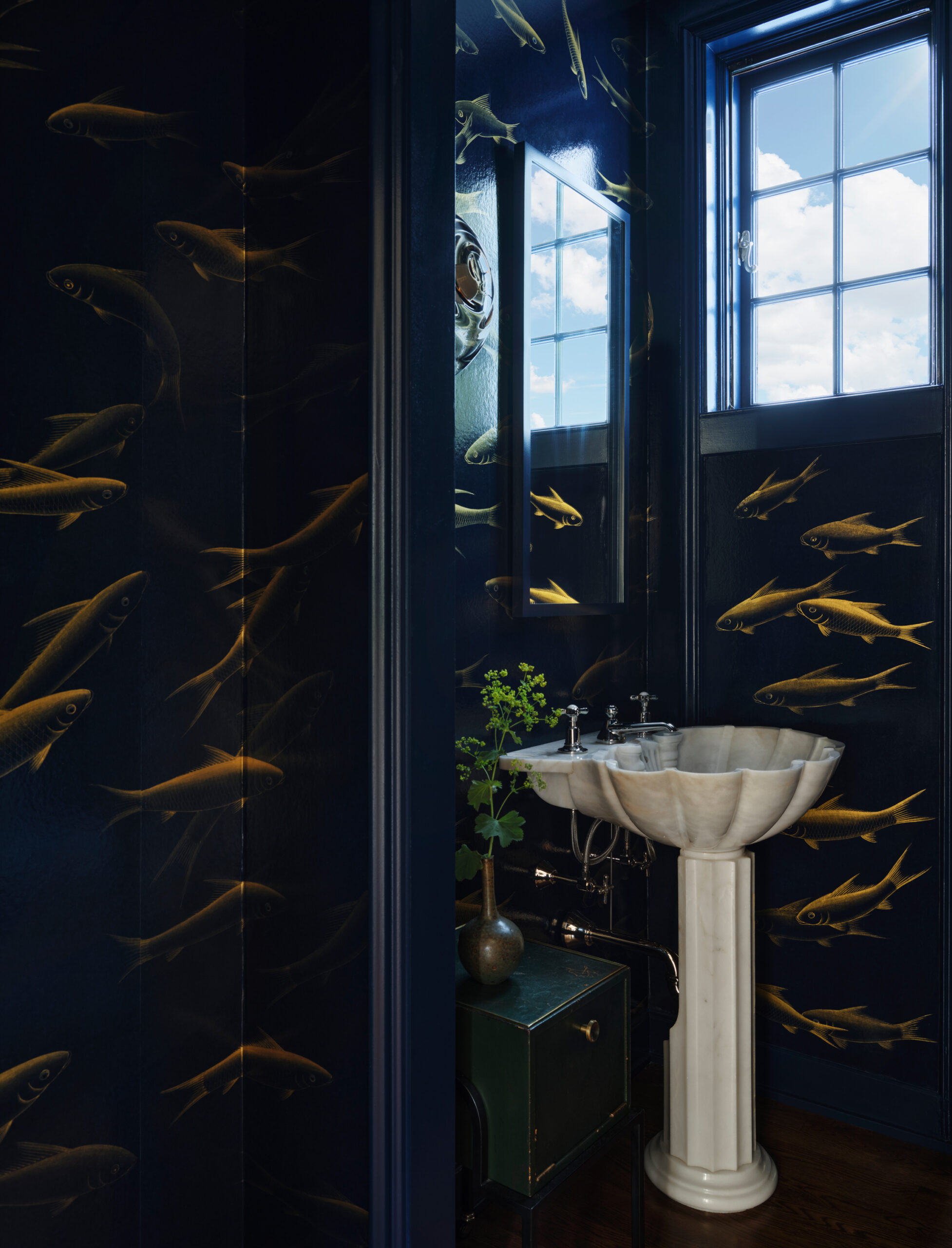 to a robin-egg blue lacquer dining table.